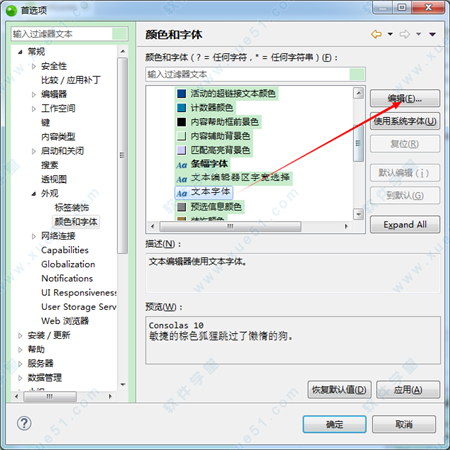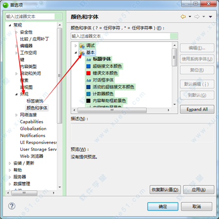 1、点击窗口>首选项>常规>外观>颜色和字体>基本