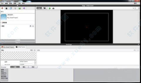 1、游戏选项卡上出现一个空白工程。通过在左上方多个选项卡之间移动,可查看场景、图层、对象、图像和音频。通过游戏选项卡,你可更改工程信息,新增标题和缩略图,并轻松导航至工程的其他部分。选择“场景 (Scene)”后会出现场景向导,此时你可新增或删除场景,对场景重新命名以及调整场景顺序