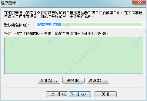 4、为定制安装的程序设定名称和图标,让用户定制安装程序的名称,所示的是文件的显示图标,一般指特定的可执行文件,所示的是一些文件图标信息的操作按钮,用户可以进行“添加”、“删除”和查看明细的“详细”等操作