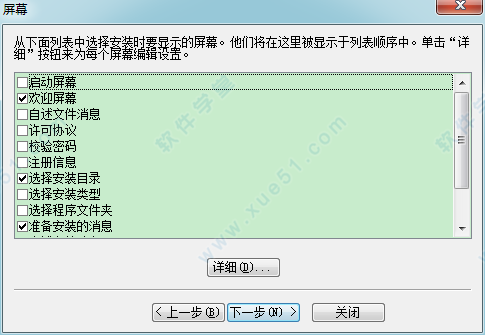 “屏幕”对话中,各个项目分别对应于一种功能,可以在用户安装您的软件其他 时,分别实现一定的功能,由于都是中文,一看便知,在些不多说了,“启动屏幕”可以让您选择属于您自己的一张图片,“自述文件消息”可以写入软件其他 的介绍等等。总之,在此您可以定制一个完全个性化的安装界面。记住,要想实现该功能,必须在小方框内打钩,如果实在很懒,那您就什么也别动,使用默认值,然后单击“下一步”
