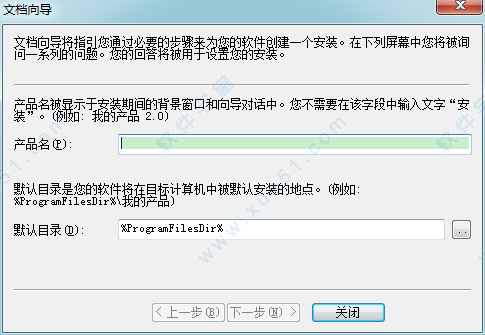 2、点击图标后,出现“文档向导”对话框,请在“产品名称”一栏中填入您所开发的软件的全称,在“默认目录”一栏中填入您希望用户使用的默认安装目录,然后单击“下一步”