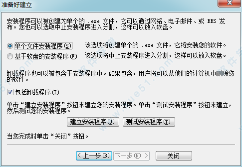 在“准备好安装”对话中,默认选项为“单个文件安装程序”以及“包括一个卸载程序”,一般使用默认值,当然您也可以更改