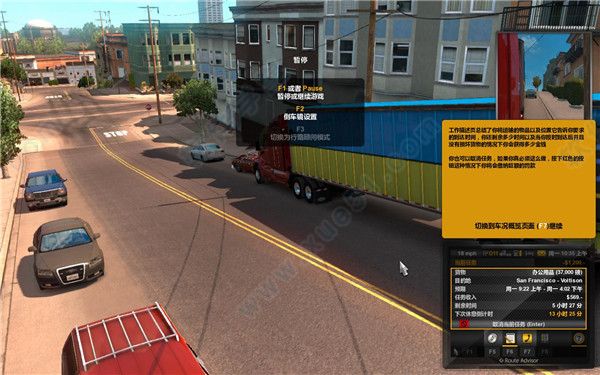 4、剩下的时间,努力开跑。拉货到一个城市,就在当地找报酬最合理的价格任务开始,反复反复反复的跑,偿还分期付款的同时赚钱。等钱还的差不多了,好了,接着贷款40万美刀,把车库升级,招牌司机买卡车到满仓。一直达到两个车库招满司机。