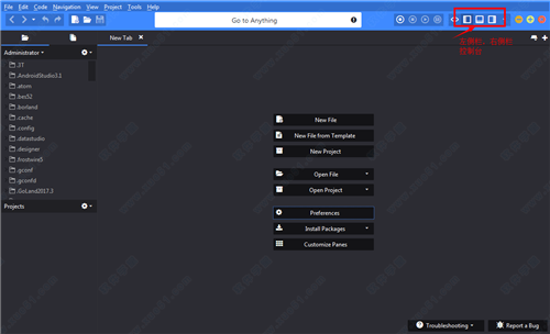 2、点击右上角的三个方框,即可调出左侧栏,右侧栏和输出控制台