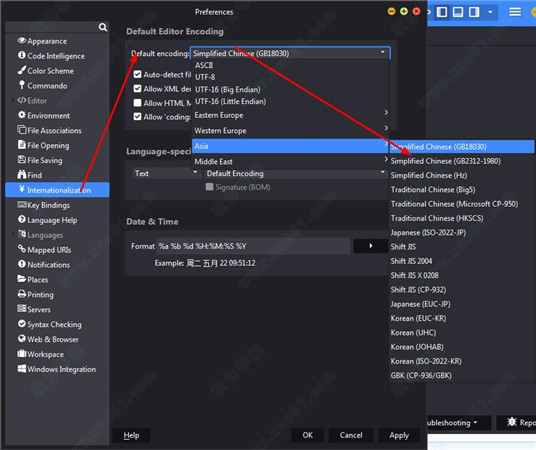 启动Komodo,选择Edit->Preferences菜单,找到“Internationalization”,在“Default Encoding”下拉菜单中找到“Asia->Simplified Chinese(GB8030)” 应用,保存就可以了