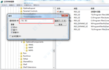2、在注册表编辑器中,点击"编辑"->"查找"->"输入缺失的dll",然后删除.可能不止出现一次,请继续"查找下一个",再删除。