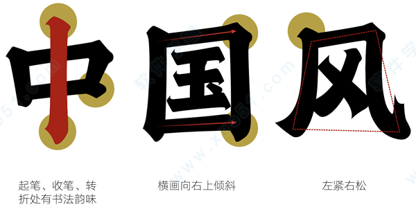 西文笔画模仿中文设计特征,略带倾斜角度,使字形呈梯形,稳定有气势。西文每笔都带有内凹的弧线,增加西文的动感,既符合传统西文审美,又平衡了汉字笔画向右上倾斜带来的动势。