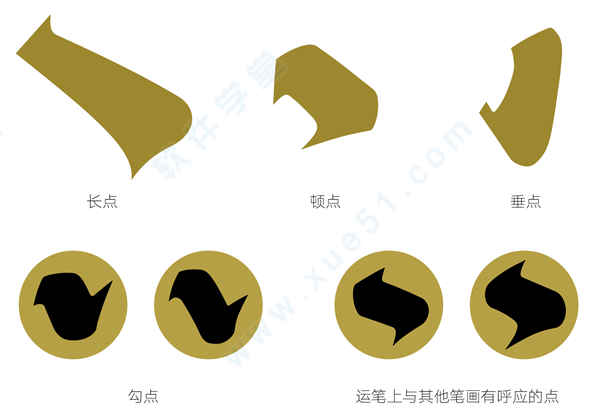 不同位置的点画在终端的装饰和笔画走势上也有各自的特征和差异。