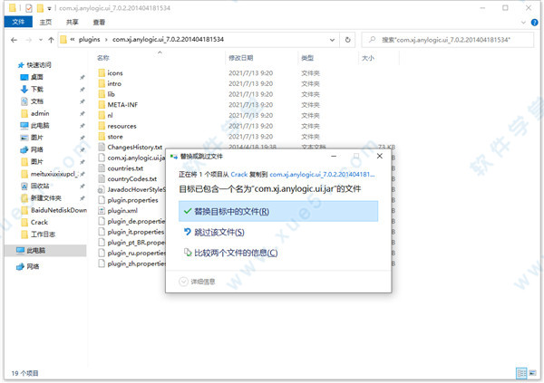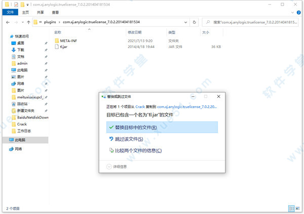 6、然后我们打开破解文件夹,将 tl.jar文件复制到:C:Program FilesAnyLogic 7 Professionalpluginscom.xj.anylogic.truelicense_7.0.2.201404181546(默认路径),点击替换目标中的文件。