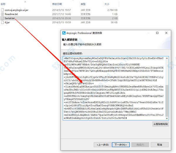 9、如图所示将Serial.txt中的序列号复制到输入框中点击下一步进行注册激活。
