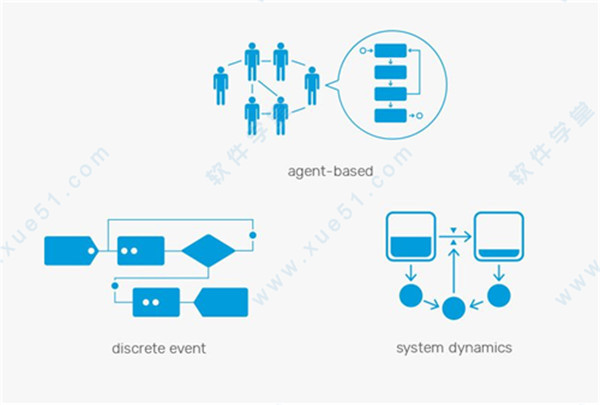 1、使用一种工具开发基于智能体、系统动力学、离散事件、连续和动态的系统模型,或在同一模型中组合这些方法。