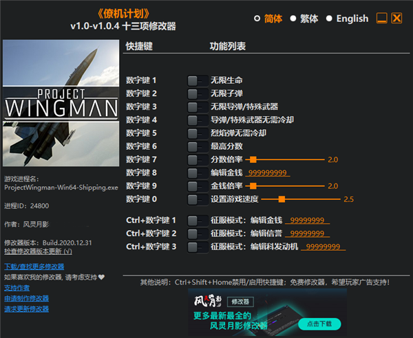 僚机计划修改器风灵月影版是一款为同名游戏精心打造的游戏辅助工具,软件能够通过修改游戏数据来给玩家们提供多项便利功能。软件能够给玩家提供十三项功能,这些功能能够在游戏中任意的场景之中开启以及关闭,玩家们只需要按下快捷键即可开启对应功能。软件能够给用“无限生命”“无限子弹”等战斗功能,帮助玩家们在驾驶飞机战斗的过程之中,能够更加轻松的战胜自己的对手。软件还能够提供“无限导弹/特殊武器”的功能,玩家可以把导弹当成子弹来进行使用,对敌人形成强大的火力压制。软件还有这其他更多的功能,能够让玩家的角色全方位的得到提升。小编今天带来的是僚机计划修改器风灵月影版,该版本游戏无需玩家安装即可使用,感兴趣的用户可以在本页面的下载链接处进行下载。