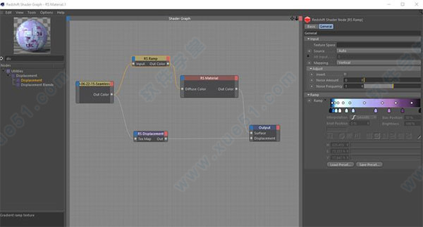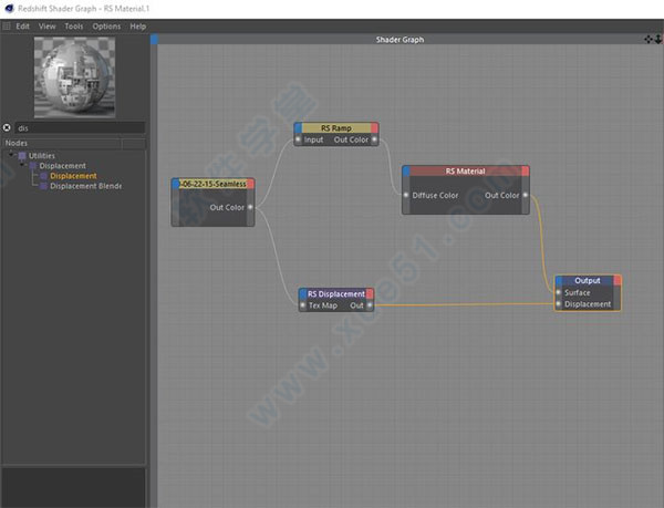 新建Redshift材质,打开材质编辑器。拖入贴图,搜索并添加Ramp,Displacement,关系连接如下图