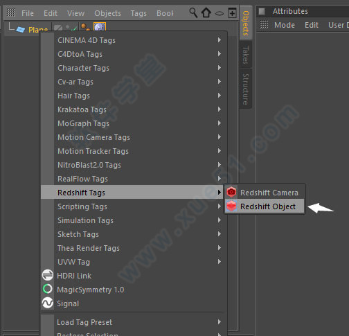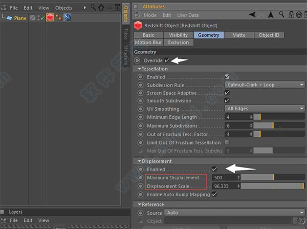 将材质应用到plane,并添加Redshift Object标签以应用displacement;