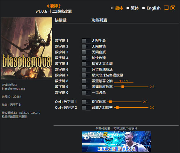 渎神修改器风灵月影版是一款为同名游戏精心制作的游戏辅助工具,它总共能够给玩家提供十二项功能,这十二项功能能够从全方位的提升玩家角色的实力,让玩家在游戏中获取到更好的游戏体验。相信很多玩家在玩这种类型的游戏的时候,总是会出现被敌人击杀的情况,而被击杀后会丢失一部分游戏进度。但是通过这款软件所提供的的“死亡后原地复活”则是能够非常有效的提高容错率,让玩家能够放心大胆的去打架,无需担心丢失进度或者掉落装备的情况。而软件所提供的“无限生命”“无限热情”等功能则是能够让玩家直接无视敌人的攻击。软件还有这其他多项功能等待你的体验。小编今天带来的是渎神修改器风灵月影版,该版本软件无需用户付费即可畅享软件功能,感兴趣的用户可以在本页面的下载链接处进行下载。