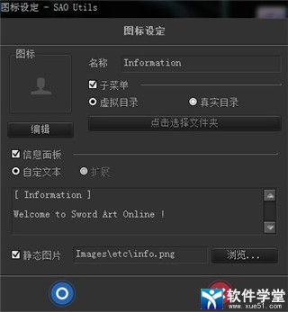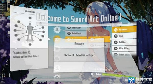 SAO Utils是款功能强大且非常美观的桌面美化软件。通过该软件可以一键设置启动任何玩家想要的软件,全新的独特交互系统,让用户对自己的电脑有着不一样的操作,同时炫酷的界面以及非常美观亮眼的UI,让用户的桌面瞬间就变得靓丽时尚了起来。滑动式的启动方式,简单轻松但又非常酷,在电脑屏幕任何一个界面中都可以通过特点的按键方式加拖动鼠标就可以启动软件的菜单,而且强大的编辑菜单可以使得用户随心设定软件各项功能,同时桌面挂件可以让用户将喜欢的网站页面、动画、图片以及视频等装饰在桌面上,不仅方便用户的使用与查找,还可以对桌面进行美观的点缀。这款桌面软件还支持立体模式显示,而且完美的复制了刀剑神域动漫中的游戏界面,科技十足,而且SAO与GGO两种不同的风格任由玩家选择。此外
