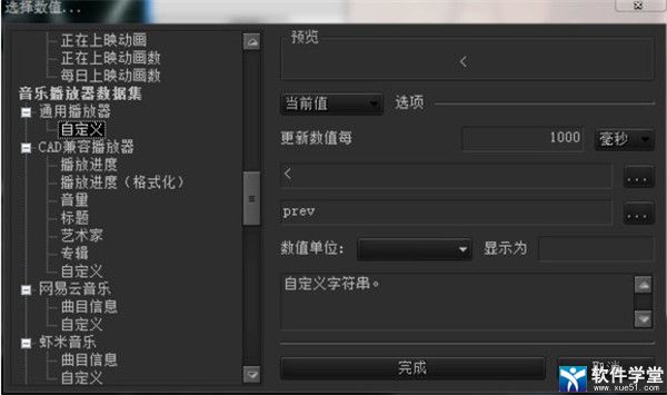 发现有的字没出来,右键那个矩形点击大小,然后调到适合的大小。音乐歌词、名称、歌手、进度条、切歌,右键矩形编辑,点数字或文本,选择数据(我是用Foobar2000装了cad插件,其他播放器也是差不多)选择你需要的数据,%@%这个是滚动代码。%@10%”表示在长度超过10的情况下滚动。自定义下面的调用参数填入play--播放/暂停、prev--上一首、next--下一首。