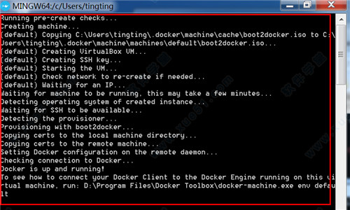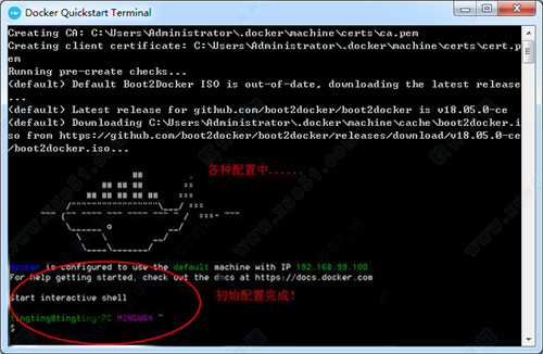 1、安装完成后,双击“Docker Quickstart Terminal”运行,软件会自动配置镜像