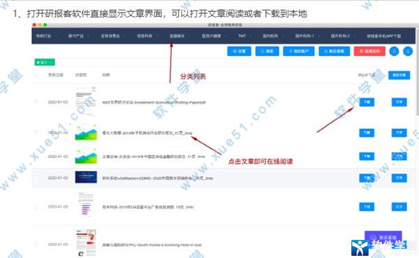 1、打开研报客,会呈现如下图所示的界面,用户可以在分类列表栏找到感兴趣的文章,直接打开文章浏览或者下载到本地后阅读。