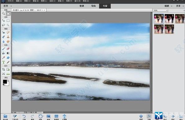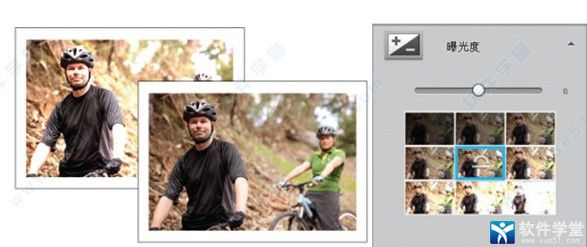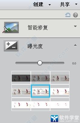 3、单击右窗格中的曝光度选项。Premiere Elements会调整照片的曝光度并显示其九个缩览图,每张缩览图以不同的曝光度级别显示。
