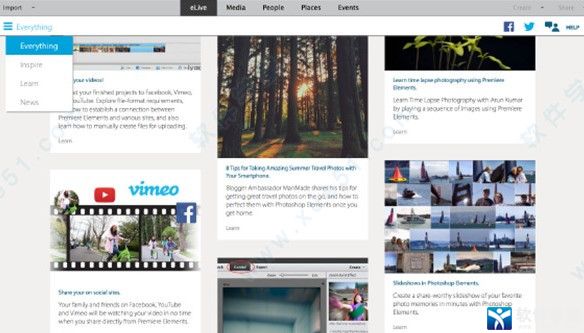 eLive 不仅在 Elements Organizer 中提供,在照片编辑器和视频编辑器中也提供。因此,在学习和使用该应用程序时,您可以直接从工作区访问学习和疑难解答资源流并使这些信息保持最新。
