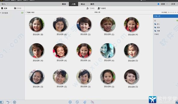 “人物”视图可通过标记照片中人物的脸部帮助您查看和组织照片。在导入照片时,Elements Organizer 会通过识别照片中相似的人脸而自动创建人物堆栈。有关更多信息,请参阅 Elements Organizer 帮助中的在照片中标记人脸并组织人物堆栈。