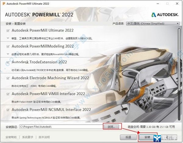 2、双击PowerMill_Ultimate_2022_ML_Win_64bit_dlm.sfx.exe文件,按照安装向导进行安装,选择“简体中文”,点击“安装”。