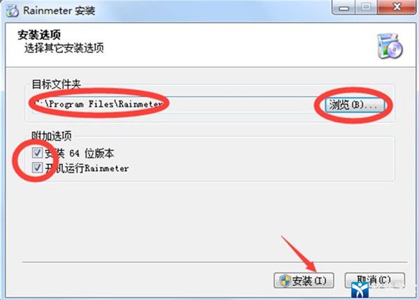 附加选项:①是否安装64位,如果你确认当前软件适合系统跟你电脑是匹配的可不用勾选,如确定建议勾选。②是否每次打开电脑都运行 Rainmeter,如果你不需要也可不勾选。