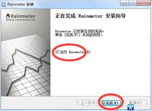 5、安装成功后将会弹出如下截图:这个界面就表示我们的软件安装成功了,如你想关闭该页面直接运行,可选“运行Rainmeter”选项并单击【完成】即可打开该软件了。