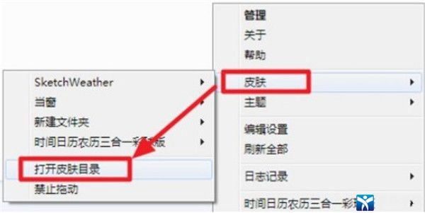 3、然后右击右下角的雨滴图标,选择【皮肤】-【打开皮肤目录】
