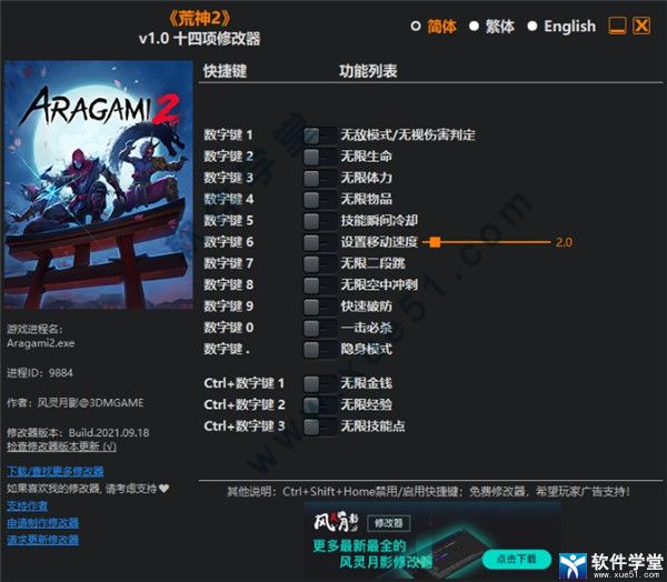 风灵月影修改器是一款功能强大的游戏辅助功能,这款软件能够在游戏中为玩家们提供多达十四项辅助功能。这些功能能够在游戏中帮助玩家更好的战斗,能够帮助玩家获取到更多的物品。这款游戏是一款潜行类动作格斗类游戏,游戏中玩家将会扮演着荒神一族最后精英战士,你将会肩负着解放荒神一族的重任。游戏中玩家需要潜行到各种位置去刺杀各种角色,这些角色往往都有着众多的士兵保护,玩家需要计划好路线才能够更好的进行自己的任务。但是百密一疏,玩家往往都会被敌人所发现,那么这时候使用这款软件所提供的“隐身模式”,将能够更好的撤离战场。软件还能够提供“无限生命”“一击必杀”等众多的战斗功能,帮助玩家更好的去赢得战斗的胜利。小编今天带来的是