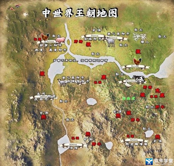 中世纪王朝资源分布图在游戏中的种子、动物和矿产都可以称之为资源,但是很多玩家都不太清楚所有资源都分布在什么地方,其实动物的分布位置比较分散,山上比较多,种子资源大部分分布在平原地区,更多如下。