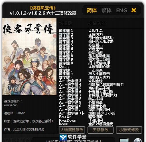 侠客风云传修改器是一款功能十分丰富的游戏辅助工具,这款软件能够在游戏中提供多达六十二项游戏辅助功能。丰富的辅助功能,可以说能够在游戏之中帮助玩家提升角色全方位的实力,让玩家能够在游戏中获得更好的游戏体验。这款游戏是一款国产的武侠类游戏,游戏中玩家将能够体验到原汁原味的江湖,在这个世界之中仗剑江湖、快意恩仇。而武侠世界之中衡量一个人是否是强者的关键就在于他的内力,内力的深厚将会影响到玩家的技能以及平A的伤害。这款软件能够给玩家提供一个“无限内力”的功能,让玩家能够拥有无限的内力,能够一直释放自己的技能。软件还有这“必定暴击”“无限生命”等众多强力的辅助功能。小编今天带来的是