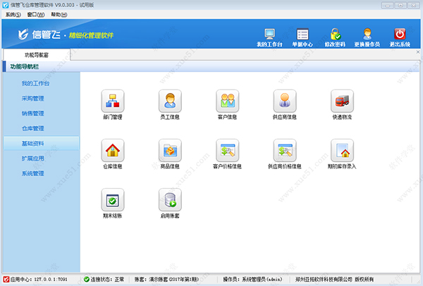 部门管理、员工管理、往来单位(客户,供应商)、仓库信息、商品信息、初期库存录入、期末结账