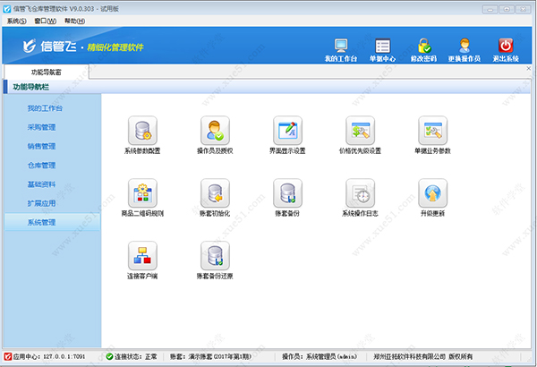 系统参数配置、操作员及授权、单据业务参数、账套初始化、结转新开张、系统操作日志、系统更新、账套备份、账套备份还原等