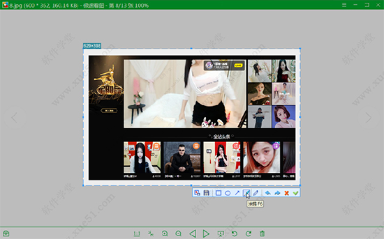 3、点击打开图片或者将图片拉入软件,即可看到软件具体功能,包括图片截图、放大、缩小、旋转、全屏、幻灯片、裁剪、图片涂鸦等功能。