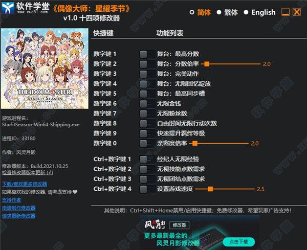 偶像大师星耀季节修改器是一款可以让玩家们在同名游戏当中进行各种功能修改的辅助工具,通过使用这款修改器我们就可以在游戏当中获得一个极其舒适的游戏体验了。偶像大师星耀季节这款游戏是万代南梦宫为了纪念偶像大师系列游戏十五周年所精心制作的,玩家们将作为一个