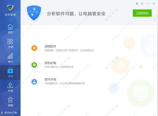 2、电脑体验分析软件问题让电脑更安全,清理软件清理病毒、流氓软件和不常用软件,让电脑更安全。装机必备安装必备软件,让电脑更全面,软件升级升级重要软件,防止软件漏洞被病毒利用。