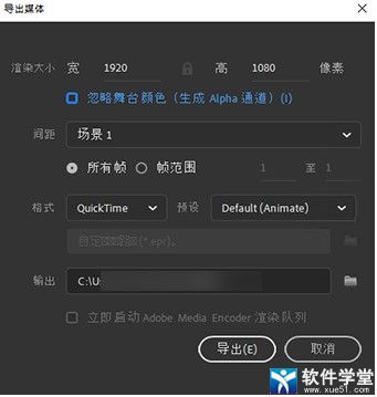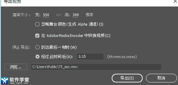 ③在 Adobe Media Encoder 中转换视频:如果您希望使用 AME 将导出的 MOV 文件转换为一种不同的格式,请选择此选项。如果选中,则在完成视频导出后,AME 将启动。