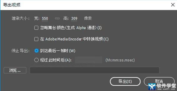 3、在“导出视频”对话框中,“呈现宽度”和“呈现高度”采用为舞台大小设置的宽度和高度值。