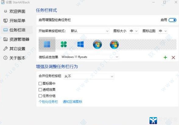 任务栏的风格整体是跟随开始菜单样式,但它也支持自由设定,主要包括两个方面:外观与行为。