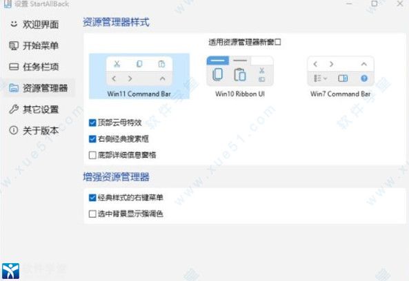 内置了一项经典右键复原功能,首先进入它的主界面,打开“资源管理器-增强资源管理器”标签,接下来勾选“经典样式的右键菜单”。