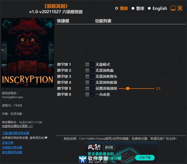 邪恶冥刻修改器是一款为同名游戏精心打造的一个游戏辅助工具,在这款游戏中软件呢过股提供六项辅助功能,虽然功能种类并不丰富但是每一项功能都非常的使用。这款游戏是一款卡牌战棋类游戏,游戏中玩家将会在谱写属于自己的冒险故事,游戏有着简单的卡牌元素,搭配上策略的玩法让玩家们沉浸其中。但是游戏难度较高,很多玩家在部分关卡的时候无法完成任务,导致游戏进度受阻。那么这时候就可以使用这款软件来帮助自己更好的进行游戏,软件能够提供“无敌模式”“无需小号血”“无需消耗骨头”“无需消耗能量”“设置游戏速度”“一击必杀”。这些功能能够有效的降低游戏的难度,让玩家们能够轻松闯过关卡。小编今天带来的是