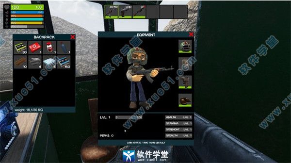 最初主角身上可谓是“身无分文”,没有任何武器弹药、医疗物资和食物的储备。因此玩家需要不断地搜刮建筑物内,例如衣柜、抽屉以及储物柜中的各种物资以维持生计。本作的物品种类可谓格外丰富,光是食物就有小到罐头矿泉水,大到汉堡功能饮料,医疗物资更不用说,有提供短暂回血的绷带还有直接回满血的药物。此外本作支持一键拾取功能,方便玩家在危急时刻“拿完直接走为上策”。不过每个物品都有各自的负重值,负重超过主角可承受的最大限度则无法携带新的物品,负重值可以通过装备背包或者升级来提升。