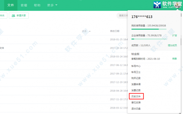 1、打开下载好的好360安全云盘,打开软件后点击右上角的头像,在弹出的选项中点击“历史文件”选项。