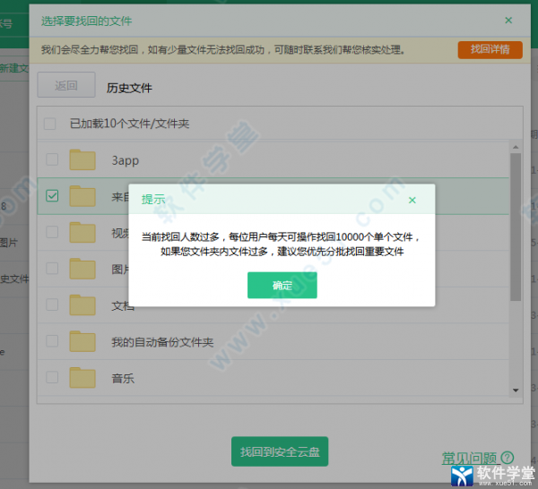 3、然后会提示您“当前找回人数过多,每位用户每天可操作找回10000个单位文件,如果您文件夹过多,建议您优先分批找回重要文件”,点击【确定】就可以了。
