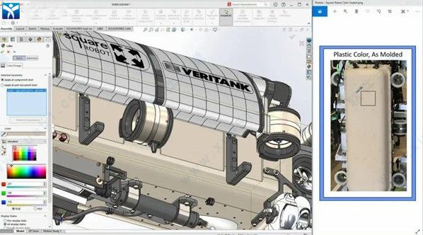 SOLIDWORKS 2021中的外观现在将包括一个“拾色器”工具,使用户可以从任何其他应用程序中选择所需的外观。选择后,外观属性和模型将立即更新。