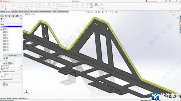 非平面相切边线上的边线法兰钣金。可对复杂的法兰执行平展操作