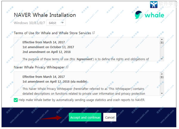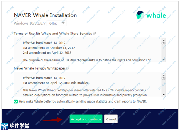 2、进入安装界面,阅读许可协议后,点击Accept and continue。