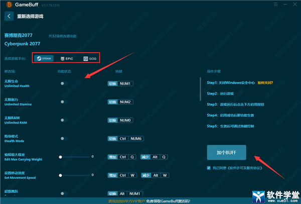 2、找到想玩的游戏,例如:赛博朋克2077,进入赛博朋克2077修改器页面,即可看到其三十二项可修改功能,选择相应的游戏平台和功能状态,点击”加个BUFF“进入游戏后即可立即生效。